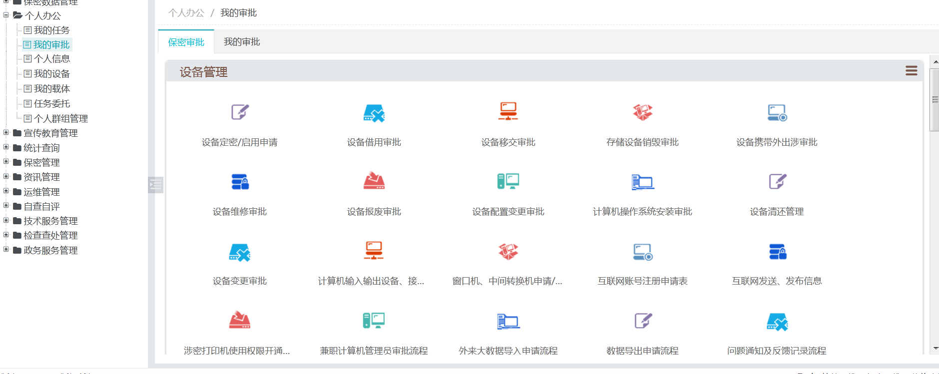 该系统主要功能涵盖保密工作机构、岗位管理、涉密事项管理、定密管理、人员管理、设备管理、载体管理、信息管理、信息系统管理、保密综合业务审批、保密检查、综合业务管理、保密要害部门部位管理、保密业务知识培训与考试管理、保密业务综合统计管理。